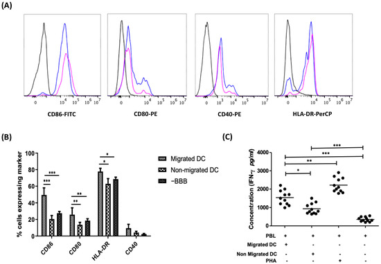 BBB-transmigratory DCs display a more activated state as compared to their non-migrating counterparts and when compared to the migrating DCs in the absence of BBBs. (A) Representative figure showing the expression of co-stimulatory markers of migrating DCs (blue peak) and non-migrating dendritic cells (pink peak) as compared to their respective isotype controls (black). The count numbers of these cells are provided in Table S1 of the supplementary information (Table S1). (B) The expression of the activation markers CD80, CD86, HLA-DR, and CD40 on migrating vs. non-migrating DCs following a chemotaxis assay in an in vitro BBB model was evaluated along with the comparison against a control sample in the absence of BBB. Migrated DCs demonstrate a significantly higher expression of CD80, CD86, and HLA-DR as compared to non-migrated DCs (n = 6) and the DCs migrating in the absence of BBB (n = 3). (C) DCs that migrate across an in vitro model of the BBB demonstrate stronger T cell-stimulatory capacity as compared to non-migrating DCs, as shown in an allo-MLR (n = 11). (* p < 0.05; ** p < 0.01; *** p < 0.001).