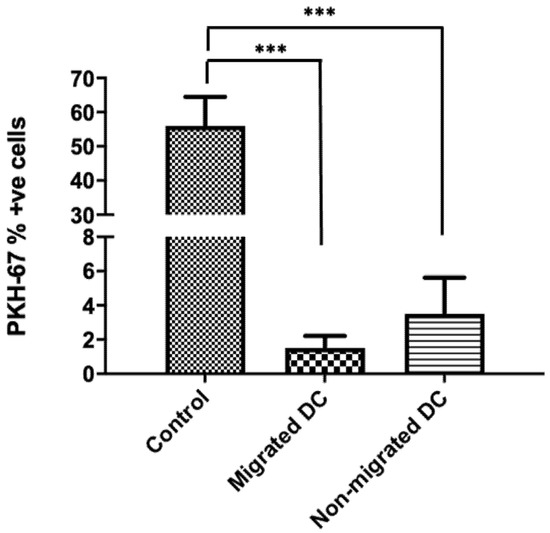 DCs do not engulf endothelial cells while transmigrating across a steady-state BBB. Migrated and non-migrated DC were harvested after a 22-h migration assay across an intact in vitro BBB (n = 7). The expression of PKH-67 was assessed on the collected migrated and non-migrated DC populations. Only a minority of DCs were PKH-67 positive. Control samples were from the fluorescently labelled endothelial cells harvested from the BBB. (*** p < 0.001).