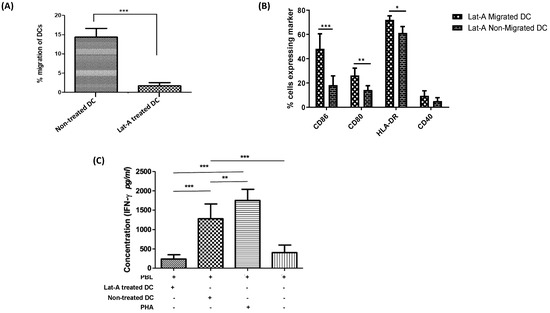 Actin cytoskeleton restructuring of DCs has no effect on migration-induced phenotypic activation but governs DC migration and T cell-stimulatory capacity. (A) Pre-treatment of DCs with latrunculin-A significantly reduces migratory capacity (n = 5). (B) Following a chemokine-driven assay in an in vitro BBB model, a comparison was made against the migratory and non-migratory DCs treated with latrunculin-A. A significantly higher phenotypic expression of activation markers CD86, CD80 along with HLA-DR was observed in the migratory DCs when compared to the non-migratory DCs with latrunculin-A pre-treatment (n = 5). (C) In an allo-MLR, responder PBLs stimulated with latruncilin-A treated DCs secreted significantly lower levels of IFN-γ as compared to PBLs stimulated with untreated DCs. Allogeneic PBLs stimulated with 1 µg/mL of phytoheamagglutinin served as a positive control and the non-stimulated responder PBLs were used as a negative control (n = 4). (* p < 0.05; ** p < 0.01; *** p < 0.001).