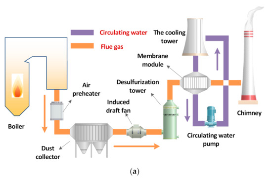 In previous studies [24,25,26,27,28], this research group also used circulating water as the cooling medium for water and waste heat recovery by ceramic membrane condenser. Figure 2a shows the water and waste heat recovery application system under the full flue gas volume of a coal-fired power plant. The tail flue gas of the coal-fired power plant boiler is discharged from the air preheater, the dust collector removes the solid dust particles in the flue gas, the wet desulfurization tower absorbs the acid gas in the flue gas, and finally, the flue gas is directly emission after recovering part of the water and waste heat through the ceramic membrane condenser. After the circulating water in the ceramic membrane condenser absorbs the water and waste heat from flue gas, the temperature continues to rise. In addition, the water temperature needs to be kept stable through the cold water tower, and then the ceramic membrane condenser continues to circulate. However, the low temperature of circulating water makes its heat unable to be effectively used.