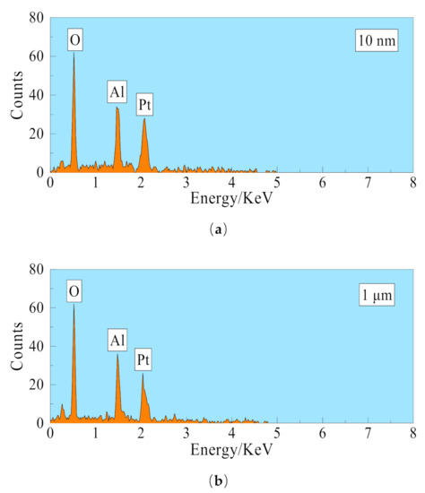 As shown in Figure 3a–c, the outer surface pore size of the 10 nm ceramic membrane is significantly smaller than the inner surface pore size of the 10 nm ceramic membrane, and the cross-section has an obvious layered structure. The 10 nm ceramic membrane is an asymmetric structure [27]. As shown in Figure 3d–f, the inner and outer surface pore size of the 1 μm ceramic membrane are basically the same in this experiment, and there is no obvious layered structure in the cross-section. The 1-μm ceramic membrane is a symmetrical structure membrane [27]. The symmetrical membrane production process is relatively simple, and the production cost is relatively low. As shown in Figure 4a,b, 10 nm ceramic membrane and 1 μm ceramic membrane after qualitative analysis by EDS (Energy Dispersive Spectroscopy), the main elements in the membrane material are O element and Al element. The Pt element in the picture is introduced by spraying gold before the test. It is confirmed that the membrane material is inorganic alumina. The ceramic membranes used in this experiment are all tubular membranes. The specific structural parameters are shown in Table 1. They are divided into four different pore sizes of 0.4 nm, 10 nm, 100 nm, and 1 μm. Except for the 1-μm ceramic membrane, which is a symmetrical membrane; the rest are asymmetric membranes. The porosity of the four types of ceramic membranes is basically the same. Moreover, the other structural parameters of the ceramic membrane are the same, with the length of 790 mm, inner diameter of 8 mm, and wall thickness of 2 mm. The ceramic membrane module shell is made of stainless steel (AISI 316L) and its length is 800 mm, inner diameter 20 mm, and wall thickness is 1 mm. The ceramic membrane module is insulated with insulation materials.