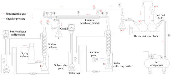 The inorganic ceramic membrane condenser using negative pressure air as a cooling medium experimental system is shown in Figure 5. The experimental system is mainly composed of a flue gas generation subsystem, a ceramic membrane module subsystem, a flue gas drying subsystem, a semiconductor refrigeration subsystem, and a negative pressure air condensing subsystem. The simulated dry flue gas in the flue gas generation subsystem is continuously and stably supplied by an air compressor. The dry flue gas is measured by a metal tube float flowmeter and then enters a two-necked flask in a constant temperature water bath. The flask contains quantitative desulfurization wastewater after pretreatment, which is used to achieve heating and humidification of dry flue gas to wet saturation. The membrane module subsystem has a sleeve structure, and the wet saturated flue gas enters the shell side of the membrane module, and the negative pressure air enters the tube side of the membrane module. The flue gas and airflow in the opposite direction for heat and mass transfer in the membrane module. The flue gas at the outlet of the ceramic membrane module is condensed by the serpentine condenser and is dried by the drying tower, finally is discharged directly to the atmosphere. At the same time, the flue gas drying subsystem can also be used to verify the supersaturation coefficient of the simulated flue gas. The semiconductor refrigeration subsystem is made by semiconductor modules, and is used to make low-temperature circulating water which is used for flue gas or negative pressure air condensation. The air condensing subsystem uses air as a cooling medium to absorb water and waste heat from flue gas. The inlet of the vacuum pump is connected with the outlet of the serpentine condenser to provide a certain negative pressure environment. The water collection device is used to collect negative pressure air condensate, so as to effectively measure the amount of recovered water.