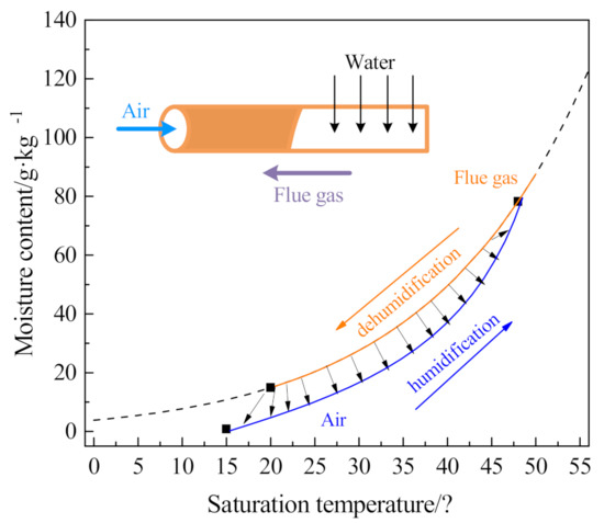 As shown in Figure 6, the simulated flue gas outside the ceramic membrane is wet and saturated; however, the negative pressure air inside the ceramic membrane has a relatively low relative humidity. The two flow in the ceramic membrane module in the reverse direction, and simultaneously carry out the transfer of water and waste heat [29]. The moisture content of the flue gas in the ceramic membrane module shell side gradually decreases along the moisture saturation line, which is a cooling and dehumidification process. While the temperature and moisture content of negative pressure air in the ceramic membrane module tube side continue to rise, which is a heating and humidification process, and it may eventually reach a moisture saturation state [20].
