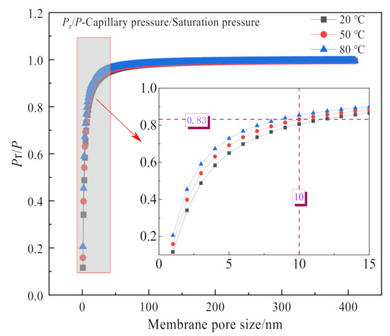 The inorganic ceramic membrane is a porous material. According to the Kelvin equation, the water vapor in the flue gas will undergo capillary condensation in the porous material below the saturated vapor pressure [27,30,31]. As shown in Figure 7, the smaller the membrane pore size, the more obvious the capillary phenomenon. At the same time, combined with the membrane pore size selected, it can be considered that capillary condensation will occur within the pore size of 0.4 nm and 10 nm ceramic membranes, while capillary phenomenon will not occur in 100 nm and 1 μm pore size ceramic membranes [2,32]. Considering that the tube size and shell size of the ceramic membrane module are gas-phase fluids, Figure 8 shows that the mass transfer process of flue gas moisture across the membrane can be roughly divided into three steps [33]: the condensation process on the outer surface of the membrane, the transfer process within the membrane pores, and the evaporation process on the inner surface of the membrane. Because the outer surface of the membrane is coated with a hydrophilic selective separation layer, the condensation process is mainly cooling condensation and film condensation [18]. When the membrane pore size is smaller, capillary condensation will occur due to capillary forces, which will help the outer surface of the ceramic membrane to condense [6]. The liquid water in the membrane pores is transported from the outer surface of the ceramic membrane to the inner surface of the ceramic membrane under the pressure difference. The tube size of the ceramic membrane module is negative pressure air. Under the conditions of relative humidity and negative pressure, liquid water on the inert surface of the ceramic membrane continuously evaporates into the negative pressure air. At this time, when the membrane pore size is smaller, the capillary force will hinder the evaporation of water.