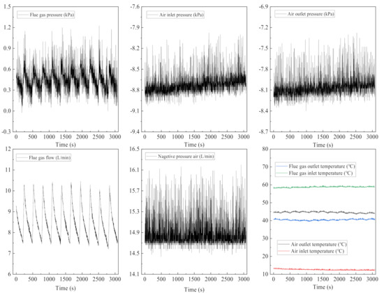 The experimental system runs continuously for 30 min, and the state parameters are shown in Figure 9. The flue gas flow and flue gas pressure show regular fluctuations, which are determined by the working principle of the air compressor. When the air compressor tank pressure is within a certain range, the air compressor is in a stopped state. When the pressure is lower than the set value, the air compressor starts to start. The inlet and outlet pressure of the ceramic membrane module tube side is relatively stable, and the outlet pressure is greater than the inlet pressure. The negative pressure air absorbs water and waste heat from flue gas, leading to an increase in the outlet temperature and contains a lot of water vapor. The negative pressure airflow in the ceramic membrane is relatively stable. The inlet and outlet temperature of the flue gas and negative pressure air in the ceramic membrane module are relatively stable, and the order is > > > .