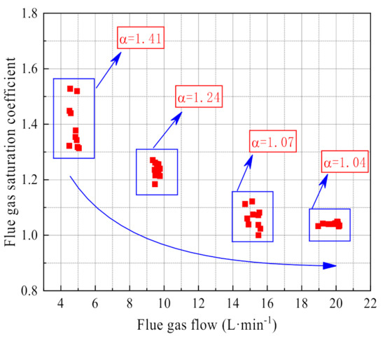 As shown in Figure 10, the flue gas supersaturation coefficient changes greatly with the flue gas flow. When the flue gas flow is low, the supersaturation coefficient is higher and fluctuates greatly. When the flue gas flow increases, the flue gas supersaturation coefficient gradually stabilizes and tends to 1. When the flue gas flow is low, the gas-liquid separation device uses the inertia of the airflow to separate the droplets poorly, resulting in the flue gas supersaturation coefficient being too high. When the flue gas flow is 4.75 L/min, 9.47 L/min, 15.2 L/min, and 19.83 L/min, the average flue gas supersaturation coefficients are, respectively, 1.41, 1.24, 1.07, 1.04.