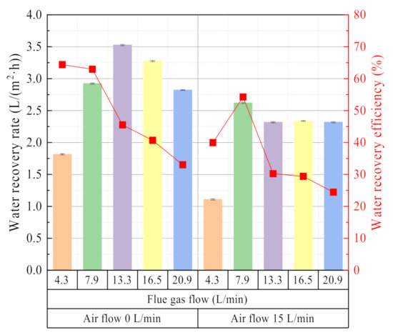Water recovery rate/efficiency vs. Flue gas flow. Experiment conditions: flue gas inlet temperature 56.36 °C, negative pressure airflow 15 L/min, negative pressure air inlet temperature 14.08 °C, membrane pore size 10 nm.