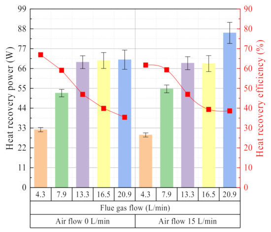 In the above two cases, the effect of flue gas flow on heat recovery characteristics is relatively consistent. As shown in Figure 12, when the flue gas flow increases, the heat recovery power increases, but the heat recovery efficiency decreases. These experimental results are consistent with the literature [27,30,34]. As the flue gas flow increases, it helps to maintain a higher heat exchange temperature difference and reduce the thickness of the non-condensable gas boundary layer in the membrane shell side. Therefore, the heat recovery power rises with the increase of the flue gas flow. However, more heat is discharged out of the ceramic membrane module along with the flue gas before it can be recovered, resulting in a decrease in heat recovery efficiency.
