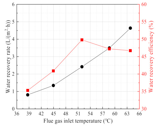 Figure 13 shows the change curve of water recovery rate and efficiency with flue gas temperature. The water recovery rate shows a continuously increasing trend with the increase of flue gas temperature, while the water recovery efficiency first increases and then decreases with the increase of flue gas temperature. Compared with the literature [18,33,34,37], the experimental results in this paper show the same regular variation for the water recovery rate, but there are some differences for water recovery efficiency. In the literature [34], the water recovery efficiency increases with the increase of flue gas temperature. In the literature [33], the water recovery efficiency decrease with the increase of flue gas temperature. In the literature [33,34], there are obvious differences in the arrangement and area of the ceramic membrane tubes, leading to different experimental results. Compared with the literature [33,34], the cooling medium is negative pressure air in this paper. When the flue gas temperature increases, the moisture content and water vapor partial pressure increase exponentially in the wet saturated flue gas [18,26,38]. The condensation process on the membrane module shell side, the transport process across the membrane and the evaporation process on the membrane module tube side are all enhanced; thus, the water recovery rate increase. However, the water recovery efficiency is affected by water recovery rate and moisture content of flue gas. When the flue gas temperature is low, increasing the flue gas temperature, the moisture content of flue gas increases slowly, resulting in a growth multiple of the water recovery rate higher than the growth multiple of the moisture content of the flue gas. When the flue gas temperature is high, increasing the flue gas temperature, the moisture content of flue gas increases rapidly. The growth multiple of water recovery rate is lower than the growth multiple of moisture content of flue gas. Therefore, the water recovery efficiency first increases to the maximum value and then decreases.