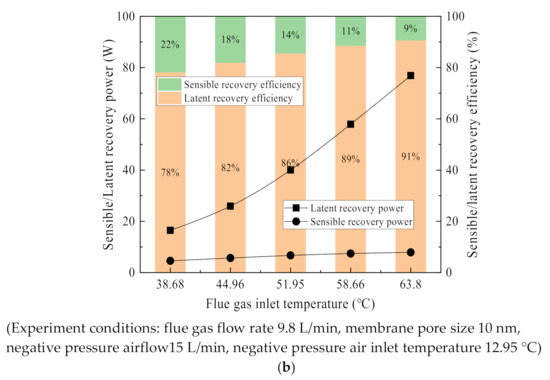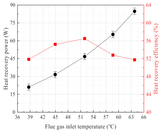 The flue gas heat recovery power and efficiency show the same change curve as the water recovery characteristics. As shown in Figure 14, as the flue gas temperature increases, the heat recovery power continues to increase. While the heat recovery efficiency first increases and then decreases. Regarding the effect of flue gas temperature on the heat recovery power, the experimental results in this paper are consistent with the literature [18,27,37]. However, regarding the effect of flue gas temperature on the heat recovery efficiency, the experimental results in this paper are somewhat different with the literature [27] because the increase of flue gas temperature helps to increase the heat exchange temperature difference of the membrane module. When the flue gas temperature is higher, the moisture content also increases, and the phase change heat is stronger. However, negative pressure air has a lower cooling capacity compared to the circulating water. After the heat recovery efficiency increases to the maximum, the flue gas temperature continues to increase, which is limited by the remaining fixed experimental parameters, inevitably leading to the heat recovery efficiency to decline.