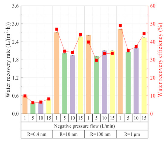 The negative pressure airflow mainly affects the water and waste heat recovery characteristics from two angles: condensation on the outside surface of the ceramic membrane and evaporation on the inside surface of the ceramic membrane. It can be seen from Figure 15 that under any same membrane pore size, as the negative pressure airflow increases, the water recovery rate and efficiency show a trend of first decreasing and then increasing. Basically, when the negative pressure airflow is 5 L/min, the water recovery rate and efficiency are the lowest value. When the negative pressure airflow is 1 L/min, the vacuum degree in the ceramic membrane is higher, which helps the evaporation of liquid water on the inside surface of the membrane. When the negative pressure airflow is 15 L/min, the negative pressure in the ceramic membrane is small. However, the high negative pressure airflow has a strong cooling capacity, which helps the condensation process on the outside surface of the ceramic membrane to occur. When the negative pressure airflow is 5 L/min, it weakens the process of evaporation on the inside surface of the ceramic membrane and condensation on the outside surface of the ceramic membrane and results in the lowest water recovery rate and efficiency. The water recovery rate and efficiency in this paper are much higher than the study results in the literature [6]. The membrane condenser used in this paper is a porous ceramic membrane, while the membrane condenser used in the literature [6] is a dense hollow fiber membrane.