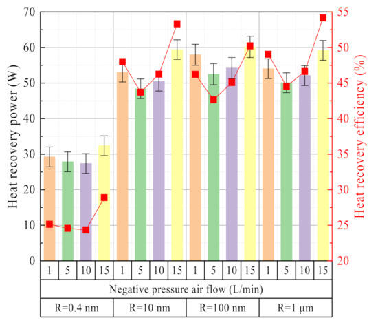 The influence of the negative pressure airflow on the heat recovery characteristics is basically the same as the water recovery characteristics. As shown in Figure 16, both of which show a change characteristic of first decreasing and then increasing with the increase of the negative pressure airflow. When the vacuum degree is larger, the heat absorption of liquid water evaporation is dominant by high vacuum. When the negative pressure airflow is large, the heat absorption of liquid water is dominated by relative humidity. At this time, the heat recovery power and efficiency reach the maximum. The inorganic ceramic membrane has a strong coupling and synchronization effect on the water and waste heat recovery characteristics from the flue gas.
