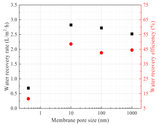 Water recovery rate/efficiency vs. Membrane pore size. Experiment conditions: flue gas inlet temperature 56.27 °C, flue gas flow 10.58 L/min, negative pressure airflow 0 L/min.