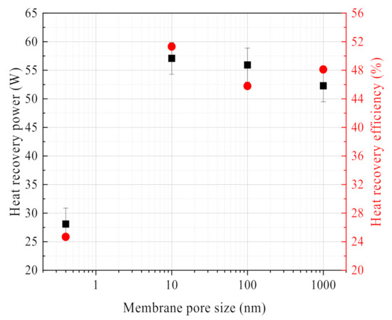 Heat recovery power/efficiency vs. membrane pore size. Experiment conditions: flue gas inlet temperature 56.27 °C, flue gas flow 10.58 L/min, negative pressure airflow 0 L/min.