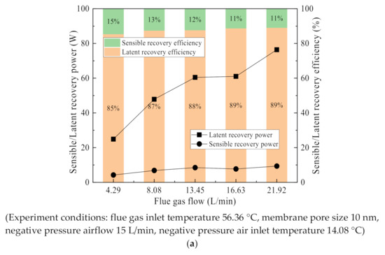 There is a large amount of water in the form of water vapor in the low temperature wet saturated flue gas, so the flue gas waste heat recovery can be divided into sensible heat recovery and latent heat recovery. As shown in Figure 22, the flue gas latent heat recovery power increases significantly with flue gas temperature and flue gas flow, while the flue gas sensible heat recovery power increases slowly. At the same time, latent heat recovery is the main heat recovery power, accounting for up to 90%. The sensible heat recovery is relatively small, accounting for only about 10%. It was also confirmed that waste heat recovery is dominated by latent heat recovery in literature [37,39], but the latent heat proportion is higher in this paper. The higher the flue gas temperature, the larger the latent heat proportion of water vapor. In this paper, negative pressure air is used as the cooling medium, and the temperature difference is small between the flue gas inlet and outlet in the membrane module, resulting in a larger latent heat recovery proportion. As the flue gas flow rate or flue gas temperature increases, both the sensible heat and latent heat recovery increase, but the proportion of sensible heat decreases. Because of the higher flue gas temperature, the moisture content in the flue gas is higher, and the latent heat per unit temperature difference accounts for a relatively large amount. As shown in Figure 22b, with the flue gas temperature rises, compared with the sensible heat recovery power, the latent heat recovery power has increased significantly, and the proportion of sensible heat recovery power has been reduced from 22% to 9%. In this paper, the variation of latent heat recovery with flue gas inlet temperature or flue gas flow is exactly the opposite of the findings in the literature [37] because the flue gas in this paper is wet saturated, while the relative humidity of the flue gas is only 70% in the literature [37], which results in a lower dew point temperature.