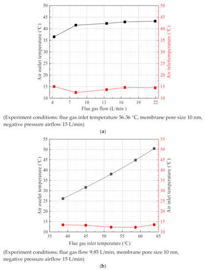 The negative pressure air in the ceramic membrane module tube side is used as the cooling medium, and the temperature is significantly increased after absorbing the waste heat from the flue gas. As shown in Figure 23, the negative pressure air outlet temperature is significantly higher than the negative pressure air the inlet temperature. At this time, the negative pressure air in the ceramic membrane absorbs a large amount of flue gas waste heat. As shown in Figure 23a, the negative pressure air outlet temperature increased slightly with the increase of flue gas flow, from 36.5 °C to 43.2 °C. While in Figure 23b, the negative pressure air outlet temperature continued to increase rapidly with the increase of flue gas temperature, from 26.2 °C up to 50.5 °C. Although the increase in flue gas flow increases the input of flue gas waste heat in the ceramic membrane module, the flue gas temperature is relatively stable. The heat exchange temperature difference in the heat transfer process is basically unchanged, resulting in a slight increase in the outlet temperature of negative pressure air. However, increasing the flue gas temperature, on the one hand, increases the input of the flue gas waste heat in the ceramic membrane module. On the other hand, there is a significant increase in the heat exchange temperature difference of the ceramic membrane module, so the negative pressure air outlet temperature changes more with the flue gas temperature.