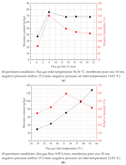 As shown in Figure 24a, with the increase of the flue gas flow, the negative pressure air moisture content at the outlet of the membrane module tube side increases first and then tends to be flat, which is consistent with the change trend of the water recovery rate. On the one hand, the flue gas flow increasing helps to increase the water recovery rate from flue gas. On the other hand, it will also cause the moisture in the flue gas to stay in the membrane for a short time and cannot be transmitted to the negative pressure air. While the relative humidity first increases and then decreases, because the relative humidity is mainly affected by the negative pressure air outlet temperature and moisture content. As the flue gas flow increases, the negative pressure air outlet temperature continues to increase, and the negative pressure air outlet moisture content eventually stabilizes, so the relative humidity will appear to change—a different trend from the moisture content.