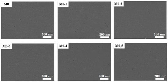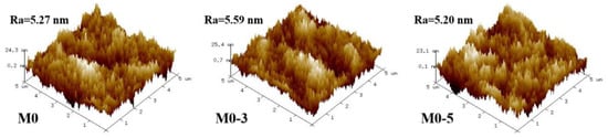 The original membrane (M0) and the modified membranes’ (M0-1–M0-5) SEM images were observed at 10 kV voltage. The surface morphology of the membrane had hardly changed (Figure 2), which was due to the fact that ClCH2COONa is a small molecule substance and the membrane pores might not have changed (Supplementary Information, SI, Figure S1) during the modification process. The basic structure of the membrane had not changed. It could be considered that the composite membrane was still intact after modification. In addition, the modification could not change the surface roughness (Figure 3, Table 1). The undulating valley ridge structure encouraged some organic molecules to accumulate in the valley [30,31], and this accumulation was difficult to wash away. A smooth membrane surface was conducive to slow the formation of the cake layer. The modification failed to achieve results in this respect, which means that protein adsorption still existed.