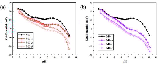 The reduced contact angle indicated that the ClCH2COONa was successfully assembled on the surface of the membrane. The introduction of hydrophilic carboxyl groups led to this result. In addition to hydrophilicity, chargeability was also affected. The zeta potentials of the original PEI/TMA membrane and the modified membrane were analyzed (Figure 5). The original PEI/TMA membrane (M0) surface was highly positively charged, which was due to the highly protonated amino group. Sodium chloroacetate was easily ionized in aqueous solution to form negatively charged CH2COO- groups, while the amino groups on the PEI/TMA membrane surface were protonated and positively charged. After the PEI/TMA membrane was immersed in the sodium chloroacetate solution, by extending the immersing time (SI, Figure S2), the CH2COO- groups were gradually attracted to the membrane surface via electrostatic interaction. In addition, influenced by negatively charged carboxyl groups, the positively charged amino groups were effectively shielded, and the positive chargeability of the membrane surface was effectively reduced.
