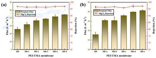 In recent years, there has been more and more research on the preparation of PEI NF membranes. Some newly developed membranes were summarized in Table 2. Combined with this work, the performance of these membranes was compared and analyzed. The PEI/TMA membrane (M0-e) had unique advantages in the removal of MgCl2 while the flux reached a high level. In the treatment of water softening and cleaning water, PEI NF membranes could have a great treatment effect. Due to the susceptibility to pollution, the quality of the influent water in the NF process needed to be treated at the front end. High pollution-resistant NF membranes could reduce the cost of the water inlet front. The modified PEI/TMA NF membranes have such characteristics of resistance to BSA protein contamination, therefore it could have very practical application prospects in water softening and household water purification.
