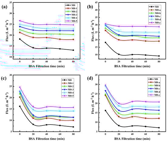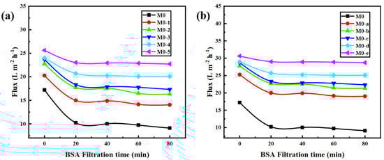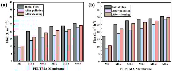 The improved hydrophilicity (Figure 4) promoted faster transportation of water molecules [38,39]. The membrane surface was more likely to form a hydration layer, which hindered the adsorption of BSA molecules. From the SEM image of the membrane surface after filtering the BSA, the adsorption phenomenon on the modified membrane surface was greatly reduced (SI, Figure S5). The reduction in the chargeability of the membrane surface was also a factor in the antipollution of the PEI/TMA membrane [40,41]. Due to the low isoelectric point of BSA (about 4.7), the high positive charge of the original membrane (M0) made the adsorption of BSA easy. After modification, a part of the protonated amino group was shielded [42,43,44] and the charge attraction was weakened between BSA and the membrane surface. Therefore, the blockage of the membrane pores was relieved. The drop rate of the flux had also been reduced (Figure 8). Hence, the modified membrane (M0-1~5, M0-a~e) showed higher water permeability and excellent antipollution ability. The best performance could be achieved after modification with 0.5% sodium chloroacetate for 10 h, and the greater degree of modification hardly worked anymore (SI, Figure S6).