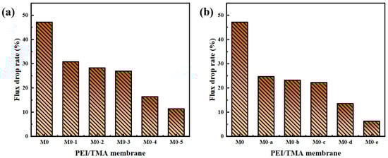 The acid and alkali environments affect the chargeability of the PEI/TMA membrane surface [45,46], and thus the degree of contamination of the membrane surface by the protein. For the pH 3 BSA solution, the modified membrane still showed strong antipollution ability and high flux (Figure 10a,b). After the modified membrane was contaminated by BSA, the flux drop rate was effectively reduced (Figure 11a,b), and the lowest drop rate was only 6.2%. In an acidic environment, the BSA molecule was positively charged and it was not easily adsorbed on the membrane surface due to charge repulsion [47,48]. Compared with the conventional test environment, the antipollution ability of the modified membrane was improved more obviously. On the contrary, ClCH2COONa modification slightly improved the antifouling performance of the PEI/TMA membrane in an alkaline environment (Figure 11c,d). Although the modification increased the initial permeability of the membrane, BSA still reduced the flux in a relatively short period of time (Figure 10c,d). Compared to a lower PH environment, the modification weakened the pollution process to a lesser degree. It was possible that pH 9 was too close to the isoelectric point of the PEI/TMA membrane. Although the modification slightly reduced the positive charge of the membrane, the charge repulsion might not play much of a role in this test environment. Therefore, the adsorption of BSA had not been weakened too much. The modified membrane showed a better antifouling performance in a neutral or weak acid environment.
