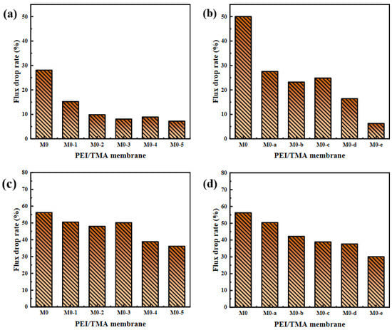 Flux drop rate of membranes in acid ((a,b), 100 ppm BSA solution, pH 3) and alkali environments ((c,d), 100 ppm BSA, pH 9).