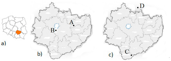 Location of sampling points: (a) Poland, Swietokrzyskie Voivodship; (b) location of the wastewater treatment plants in the Swietokrzyskie Voivodeship: A. Kunow, B. Sitkowka; (c) Jastrzab. Location of soil sampling in the Swietokrzyskie and Mazowieckie Voivodeships: C. Opatowiec, D. Jastrzab.