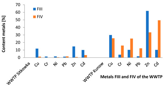 The speciation analysis of sewage sludge collected from the wastewater treatment plant in Sitkowka showed that the standards for heavy metal content were not exceeded (Table 6 and Table 7). The highest concentrations of copper, nickel, chromium, cadmium, and zinc were recorded for Fraction III; respectively, Cu 74.46%, Ni 40.89%, Cr 57.55%, Cd 43.67%, and Zn 79.86%. On the other hand, lead dominated in fraction IV (35.81%) in relation to the total content (Table 6). In the tested sewage sludge in fractions FI and FII (mobile fractions) from the Sitkowka wastewater treatment plant, copper, zinc, and lead were dominant in the range not exceeding 5% in relation to the standard in force in Poland (Figure 3) [9]. In the case of FIII (oxide fraction), the copper, zinc, and cadmium metals were at up to 15% of the applicable standard (Table 7, Figure 4) [9].