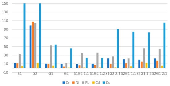 The total content of heavy metals in sewage sludge does not give information on the amount of metals available to plants. Thus, it is not possible to determine how much will enter the trophic chain. The use of sewage sludge often limits, or prevents, heavy metal content [20,21]. By using modern sequential analysis methods, we can estimate the percentage of metals in mobile form and determine the conditions for adsorption and desorption of metals in appropriate proportions of sludge–soil mixtures.