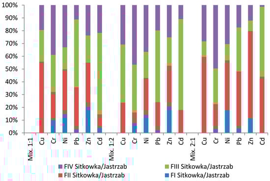 Heavy metals in the Sitkowka–Jastrzab mixtures dominated fractions FII and FIII. The highest percentage for the mobile fraction FII was recorded for copper; it was respectively 55–60% for 1:1 and 2:1 mixtures, and 23.83% for 1:2 FIV (Table 9, Figure 8). Zinc dominated the FII fraction, being 34.57% for 1:1, 31.9% for 1:2, and 68.58% for 2:1, respectively.