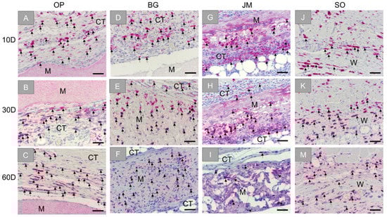 - Ghanaati, S.; Schlee, M.; Webber, M.; Willershausen, I.; Barbeck, M.; Balic, E.; Görlach, C.; Stupp, S.I.; Sader, R.A.; Kirkpatrick, C.J. Evaluation of the tissue reaction to a new bilayered collagen matrix in vivo and its translation to the clinic. Biomed. Mater. 2011, 6, 15010. [Google Scholar] [CrossRef]