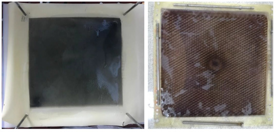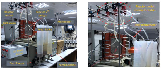 The photocatalytic feature was added to the anode compartment and operated as a photoanode using a titanium plate coated with titanium dioxide nanoparticles in the anode compartment (Figure 2). Stainless steel grade 316 L was used as cathode material. The electrodes used in the reactor were 200 × 200 mm. Accordingly, the electrode area was calculated as 400 cm2 and the active membrane area was 462 cm2. Quartz was used in the anode compartment to pass UV light on the photoanode. UV light was applied to the photoanode during the reactor’s operation using a solar simulator (Atlas Suntest). In this way, TiO2 nanoparticles reacted with sunlight to form hydroxyl radicals and enable oxidation in the reactor. The photoanode and cathode were connected via a circuit through a potentiometer. Furthermore, the photoanode chamber was aerated to facilitate photocatalytic reactions and ensure mixing.