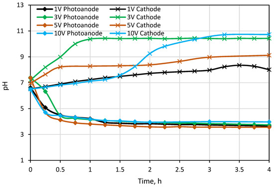 The pH change was also measured in the anode and cathode compartments during the experiment (Figure 7). An increase in the pH value was observed because OH− ions were being released as a result of converting water into H2 gas in the cathode compartment. In parallel with this, the pH value decreased slightly due to the formation of H+ ions in the anode compartment in the first 40 min of the experimental run when a 1 V potential was applied. The pH value did not change after 40 min. This could be the fouling of ion-exchange membranes due to the organic matter and inorganic divalent cations [56]. The fouling of the ion exchange membranes prevents the current transfer and decomposition of water into O2 gas, thus eliminating the formation of H+ ions. The pH results showed an increase in the cathode compartment (Figure 7) when 3 V potential was applied. In the anode compartment, pH values decreased in the first 40 min, and then a steady increase was observed until 215 min. The higher pH value in the cathode compartment compared to the 1 V potential difference was due to the increase in H2 gas formation by passing more current through the reactor.