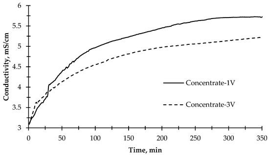 The change of electrical conductivity values of the concentrate solution, as given in Figure 6, during the desalination experiment showed that the rate of change in conductivity slowed down after approximately 100 min for both applied potential values (1 V and 3 V). The ion transfer rate in the first 120 min was calculated as 8.3 mg L−1 min−1. However, the ion transfer rate through the membranes for 350 min was calculated as 3.73 mg L−1 min−1 on average when 1 V potential difference was applied. On the other hand, when 3 V was applied to the reactor, the concentration compartment’s average ion transfer rate was 2.5 mg/L/min. In the first 120 min, the ion transfer rate to the concentrate compartment was calculated to be 5.3 mg L−1 min−1, which decreased compared with the 1 V run. The reason for this might be that when a high potential difference is applied, the reactor acts like an electrolysis reactor, and more OH− and H+ ions are produced, thus passing into wastewater. Instead of other ions, OH− and H+ ions passed rapidly to the concentrate compartment and produced water so that the increase of conductivity was limited in the concentrate compartment. At the same time, OH− ions combine with divalent inorganic ions and cause the formation of scaling on the cation exchange membrane, resulting in rapid clogging of the cation exchange membrane [55]. In addition, the photocatalytic reaction efficiency decreased when high voltage was applied. Moreover, the conductivity of the photoanode and cathode cells remained near-constant. Only minor fluctuations were observed. This phenomenon can be explained by the correlation of pH in photoanode and cathode cells. While ion exchange membranes pass the ions that cause conductivity into the concentrate compartment, the remaining ions at the relevant compartments form acid and base, thus decreasing or increasing the pH. Therefore, the conductivity remains constant because of the formation of acid and base.