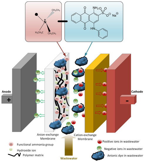 There was no oxidation on the cathode electrode in the PECM reactor. In general, the hydroxyl radical, ozone, and oxygen production occurred on the anode, so the removal of color and organic matter was expected in the anode compartment. When the reactor was operated, it was observed that the cation exchange membrane surface facing the anode compartment did not show any color due to dyes, but the anion exchange membrane surface facing the cathode chamber turned into a dark black color (Figure 8). In the textile industry, 75% of the dyes used were negatively charged reactive dyes. Reactive dyes were not oxidized during biological treatment, and their structure remained intact in the sludge and effluent. Therefore, it was concluded that the PECM treatment system needed appropriate pre-treatment processes like other membrane treatment systems. Figure 9 represents the schematic view of the membrane clogging due to the negatively charged dyestuffs. The negatively charged component of the anionic dyes is combined with the positively charged component of the ion-exchange membrane and causes irreversible fouling of the membranes. In this work, we used an anionic ion exchange resin as a pre-treatment of the PECM system to control membrane clogging. Ion-exchange resins can remove ionic dye solutions from wastewater and provide anion to the solution. Then, the anions are removed in the PECM system. On the other hand, another color removal pretreatment method such as ozonation is an alternative for the removal of dye solution. Yuzer and Selcuk [58] have used the ozonation process as a pretreatment for a bipolar membrane electrodialysis system and reported that ozonation might be the solution for ion exchange membrane clogging due to the negatively charged dyestuff. Moreover, the adsorption process might be an alternative color removal method prior to the PECM process since the process does not produce any by-product that can clog the ion-exchange membranes. However, the use of processes which produce by-products or residues that can clog the ion-exchange membranes should be avoided.