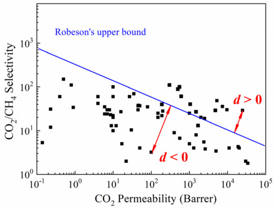 As the performance indicator (dependent variable) of CMS membranes, besides the permeability of gases (CO2, CH4, N2, O2, and H2), a quantitative index, named characteristic distance (d), was proposed in this work. Figure 1 shows the concept of d, which was the vertical distance of a black legend away from the Robeson’s upper bound line of a specific gas pair [53,54]. When the legend was above the upper bound line, the d was a positive value; otherwise, the d was negative. The d, as a quantitative index, could measure the gas separation performance of CMS membranes, including permeability and selectivity simultaneously.