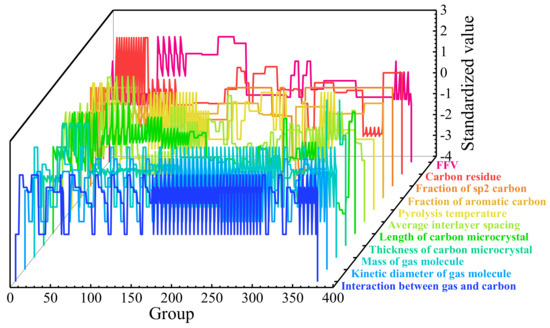 where μ and σ are the mean value and the standard deviation of the variable x, respectively. The standardized results of the variables are shown in Figure 2, which were used to show the relevance of variables qualitatively and illustrate the independence of them. Obviously, variations of different independent variables with the group number were inconsistent and did not follow a specific variation trend. Thus, it could be considered that the collected data were suitable for calculation.
