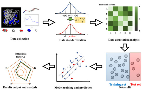 Machine learning is a computational technology to quantitatively predict the relationship between the multiple conditions and the target based on given samples [13,14]. In the fields of biomedicine, chemistry, materials, and the environment, the machine learning technique has been successfully applied to the analysis of the relationship between the characteristics and the performances of materials [15,16,17,18,19]. Specific to membrane-based gas separation, machine learning has been applied to the performance prediction and structural optimization of polymer membranes, zeolite membranes, metal-organic framework membranes, and composite membranes [20,21,22,23,24,25,26]. For CMS membrane, Behnia et al. [27] predicted the gas permeability and selectivity through statistical analysis and modeling based on five influential factors, including the type of precursor, blend composition of precursors, final pyrolysis temperature, vacuum pressure during pyrolysis, and operating pressure. The authors concluded that every factor has a significant impact on the gas permeability, especially the final pyrolysis temperature. Based on the actual measurement data of CMS membrane, the machine learning technique is feasible to discuss the influences of structural characteristics, gas properties, and other factors on the gas permeation and separation of CMS membrane.