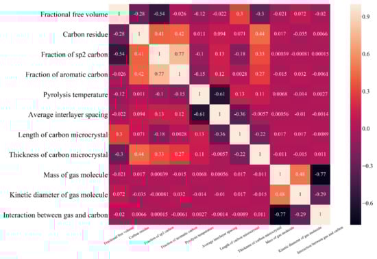 Table 1 shows the influencing factors to be discussed as the independent variables based on the structural characterization and gas permeability [34,35,36,37,38,39,40,41,42,43], including the precursor characteristic, carbonization condition, carbon microstructure, and molecular property of permeated gases. Among the characteristics of polymeric precursors, the fractional free volume (FFV) and the carbon residue influencing the porosity of CMS membrane were selected as the influential factors [44,45,46], as well as the fraction of sp2 carbon and aromatic carbon affecting the arrangement of carbon molecules [47,48]. The pyrolysis temperature, which is particularly applicable to the structural adjustment of CMS membrane, was chosen as an influencing factor [49]. The carbon microstructural factors contained the average interlayer spacing, length, and thickness of the carbon microcrystal consisting CMS membrane [6,9]. In addition, the gas molecular kinetic diameter related to the resistance, the gas molecular mass affecting the free diffusion, and the gas–carbon interaction potential influencing the gas sorption in CMS membrane were taken into consideration [50,51,52]. The calculation methods of some factors are depicted in S.2–S.4 of the Supplementary Materials.