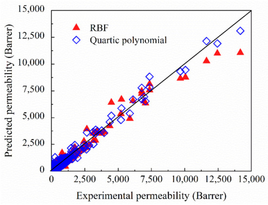 Figure 6 shows the comparison between the predicted results regressed by the SVR analytical models with two kernel functions and the experimental data of the gas permeability from all the precursors presented in Figure S1 [34,35,36,37,38,39,40,41,42,43]. The scatter points were evenly distributed on both sides of the diagonal, which indicated that the experimental data and the corresponding predicted values were close to each other.