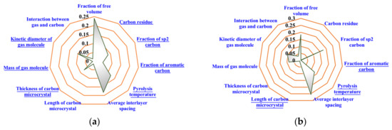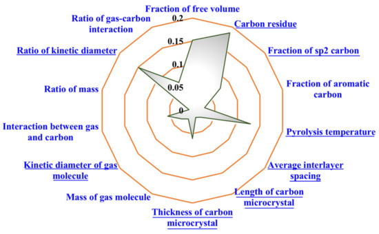 In addition, the weight of the average interlayer distance is relatively smaller than the one in Figure 7a. Increasing the interlayer distance, which would simultaneously increase the gas permeability of both fast gas and slow gas, may decline the selectivity of the gas pair which, thereby, has no significant effect on the gas separation performance of CMS membrane. The key influencing factors, i.e., the carbon residue and the FFV, are both related to the porosity of CMS membrane, as discussed above [44,45,46]. In order to improve the performance of gas permeation and selection comprehensively, priority should be given to increasing the porosity of materials of the CMS membrane if the structural parameters that need to be adjusted cannot reach the optimal level together. For the gas pairs with specific components, the interlayer spacing could be adjusted appropriately according to the kinetic diameter of gas molecules in order to improve the permeability.