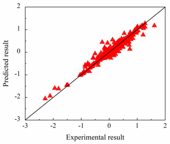 Table 4 depicts the statistical indicators based on the regression results in Figure 6. Compared with the results in Table 2, the larger R2 and smaller MAE in Table 4 indicated that selecting the appropriate kernel function and optimizing the suitable parameters was important to improve the regression effect. The larger RMSEs in Table 4 was probably because a small number of data points were not predicted accurately in order to ensure the overall regression effect. The R2 of both models with optimized parameters were larger than 0.8, which revealed the high correlation between the results calculated by the SVR models after parameter adjustment and the experimental data. In addition, the regression effect of the SVR model with RBF kernel was better for the regression, due to the larger R2 and smaller RMSE and MAE.
