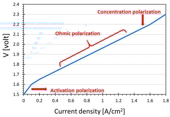 In PEM electrolysis processes, the hydrogen production rate is directly related to current drawn by the electrolyzer. However, polarization phenomena make that the operating voltage is not constant but increases with the current, and the power consumption of the cell does not increase linearly but increases more and more at high current densities. The increase of the voltage as a function of the current density determines the so-called polarization curve, shown in Figure 2. Three distinct regions exist, each of them related to one of the three different polarization types.