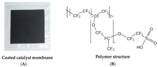 (A) Image of Ir-Pt-CCM of Nafion™ 117; (B) chemical structure of Nafion™ 117.