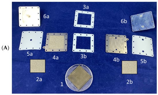 (A) Electrolyzer cell elements: CCM (1), titanium porous electrodes (2a, 2b), teflon seals (3a, 3b, 5a, 5b), cathodic (4a) and anodic (4b) current collectors, end plates (6a, 6b). (B) Schematic view of the experimental setup for the electrolysis tests.