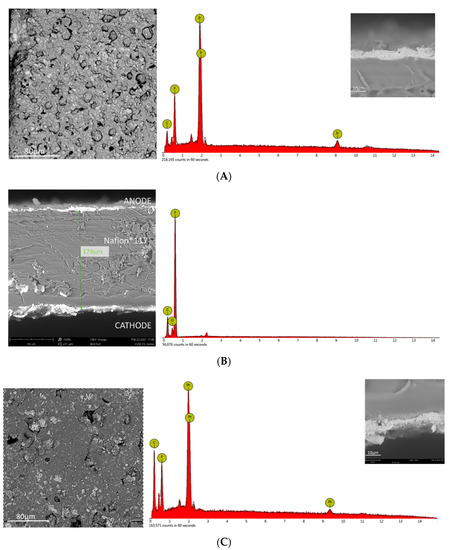 Figure 5 shows the surface morphology of the anode catalyst layer (Ir catalyst mixed with Nafion™ ionomer) and the cathode catalyst layer (Pt/C catalyst mixed with Nafion™ ionomer). The surface of the catalyst layer showed a cauliflower morphology, typical for this kind of membranes in which the surface is coated with a metal catalyst [38] (Figure 5A,C). The cross-section of the membrane shows a thickness of about 179 μm for the Nafion™ 117 polymeric layer, and a few microns for the iridium and platinum catalyst layers (Figure 5B). The EDX analysis showed the typical peaks of iridium on the anode side and platinum on the cathode side (Figure 5A,C, respectively).
