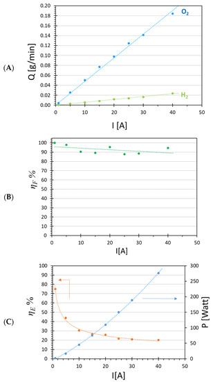 Figure 6A shows the H2 and O2 production rate as a function of the electrical current for the Ir-Pt-Nafion™ 117 CCM. Increasing the current from 1 to 40 A yielded a proportional increase in H2 and O2 production, up to the maximum value of 0.024 g min−1 and 0.18 g min−1, respectively. Over the entire range, these gas productions as a function of the current were close to the theoretical amount of gas produced according to (4), and the Faradaic efficiency varied in the range between 88% and 98% (Figure 6B).
