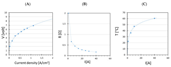 While increasing the electrical current from 1 to 40 A, cell temperature increased from 20 to 60 °C (Figure 7C). The increase in temperature was due to the system absorbing electrical power and converting it into heat. During operation at high current density and well above the thermoneutral potential, all the heat is provided by the internal production of thermal energy as a consequence of the exothermic process [19]. For this reason, greater electrical power was necessary for conducting the reaction, which increased rapidly with increasing electrical current, from 5 W at 1 A to 280 W at 40 A (Figure 6C). Consequently, the energy efficiency calculated by (5) decreased from an initial value of 75% to 25% at the highest current (Figure 6C).