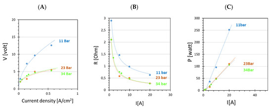 The cell voltage necessary for activating the electrolytic reaction decreased from 3 to 2 V by increasing the clamping pressure from 11 to 34 bar. Moreover, kinetic polarization was drastically reduced at a higher clamping pressure, especially when a high current was applied (Figure 8A). According to Selamet’s work about the effects of bolt torque [42], higher clamping pressure can reduce the resistance to the transport of ionic species, thanks to the tightening of the air gap between the cell components and to a better contact between the membrane and the electrodes. The lower resistance at higher clamping pressure (Figure 8B) reduced the electrical power P needed to generate H2, especially at a high current (Figure 8C).